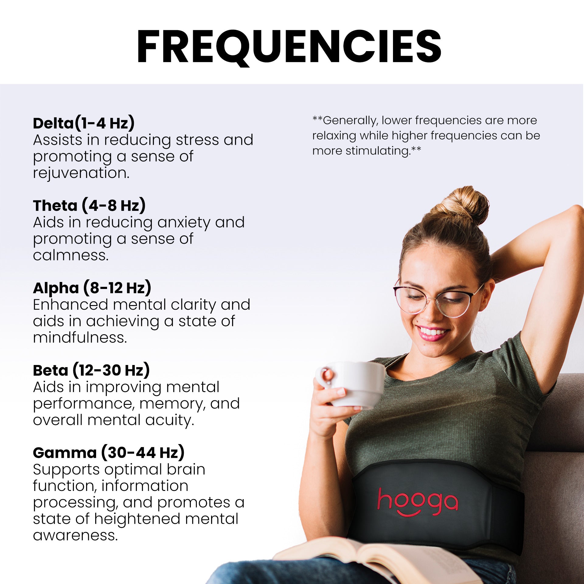 - Alpha (8–13Hz) — calm focus and stress reduction